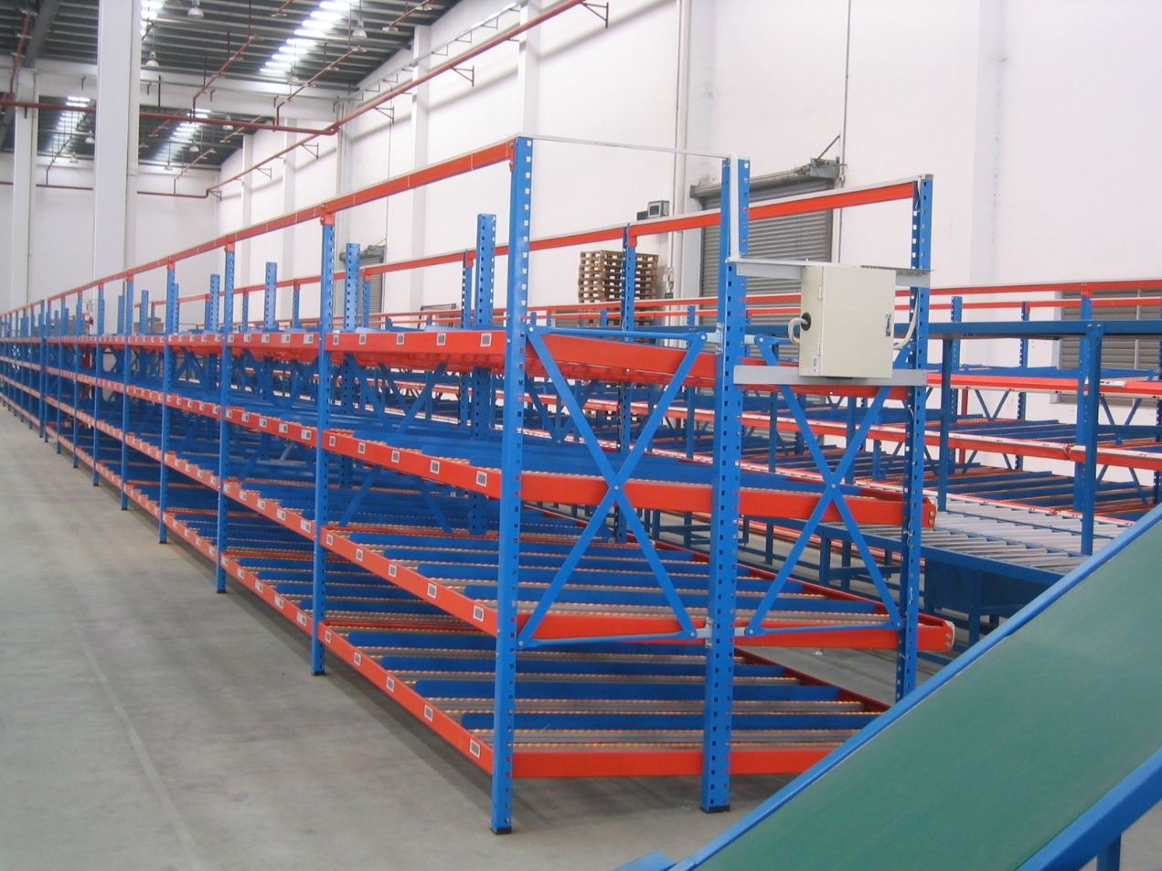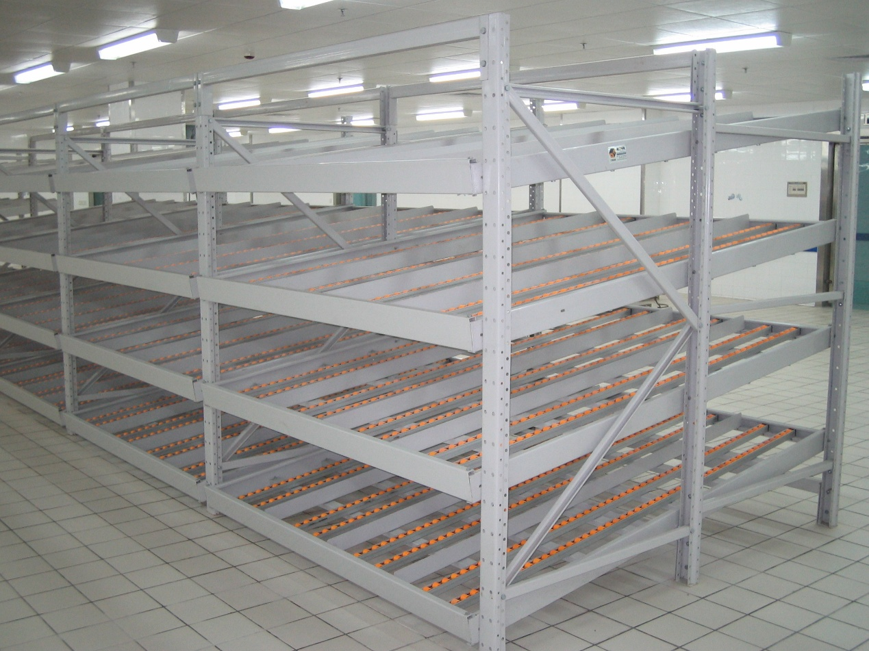 Angled shelving with rollers or wheels that allow cartons to flow from the loading side to the picking side, utilizing gravity to facilitate product movement and FIFO (First-In-First-Out) inventory management.