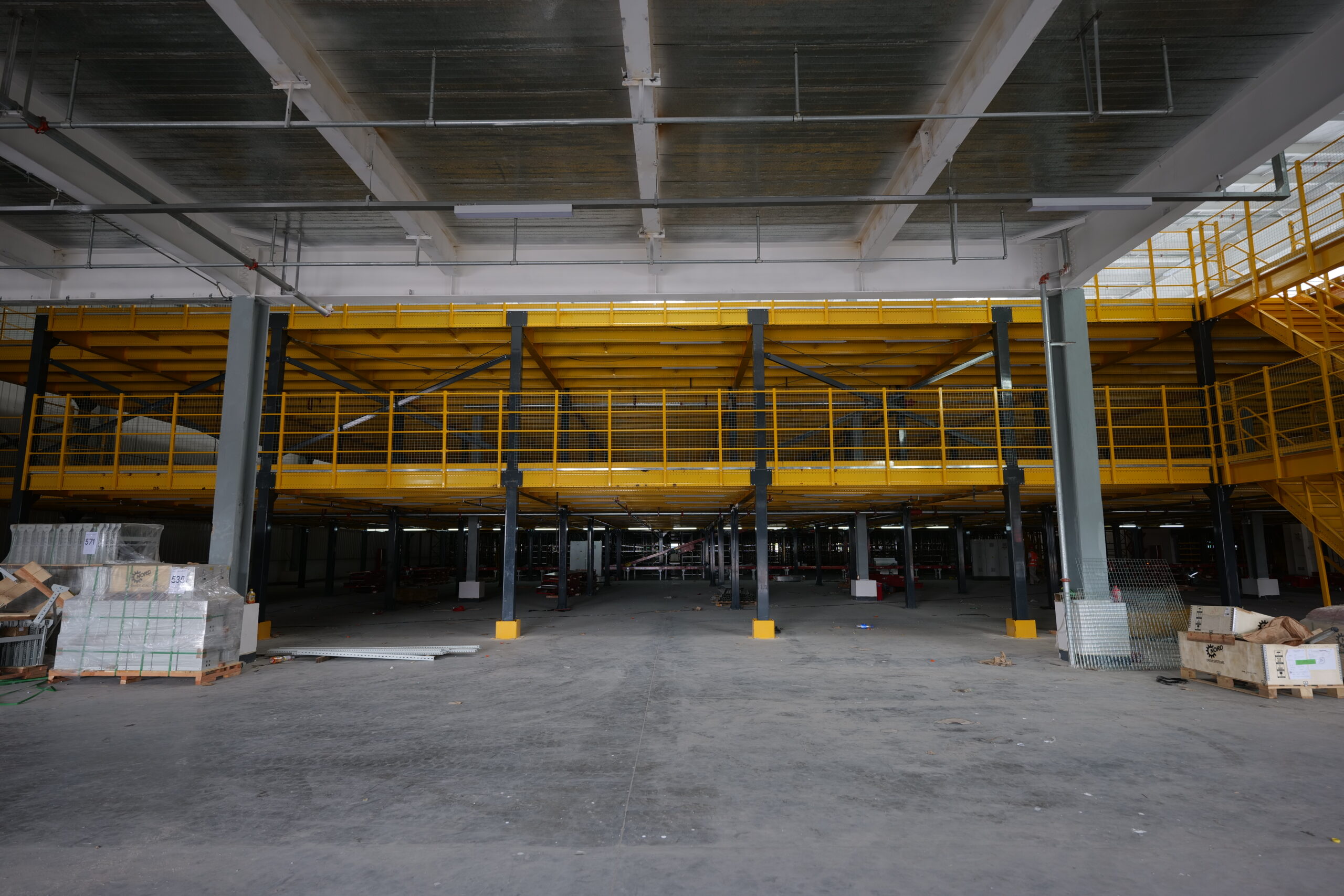 These platforms are perfect for industrial environments where space utilization is critical. The design is fully customizable to include necessary features such as material handling equipment, stairs, pallet loading gates and safety rails to ensure smooth and secure operation. The structural steel construction ensures durability and safety, supporting heavy loads and industrial equipment.